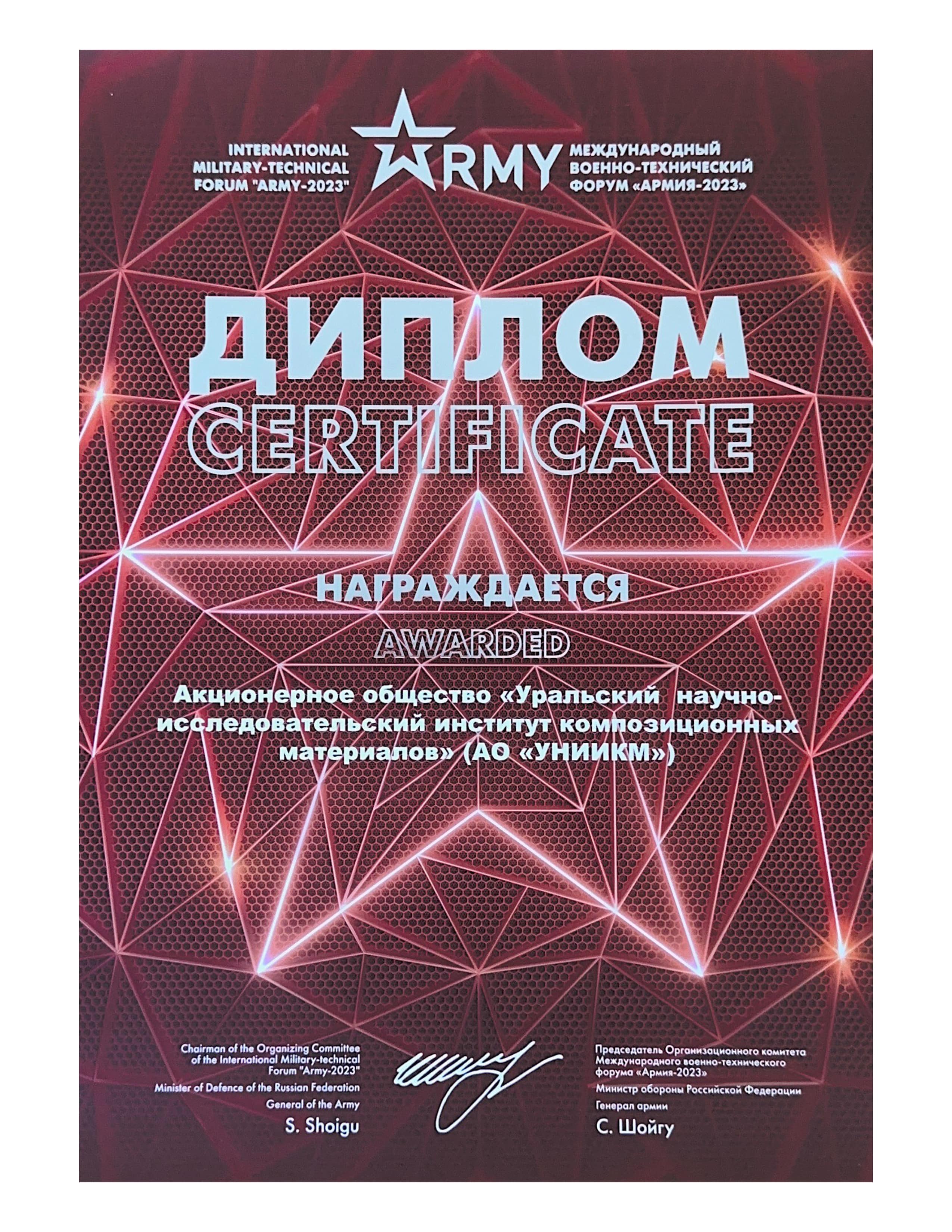 Научно-деловая программа форума предусматривала проведение 260 мероприятий по актуальным вопросам развития Вооруженных Сил Российской Федерации, оборонно-промышленного комплекса России и международного военно-технического сотрудничества с учетом современных условий. В рамках научно деловой-программы Технополисом «Эра» был организован круглый стол на тему: «Современные аспекты использования нанокомпозитных материалов в хирургии и травматологии», в котором генеральный директор АО «УНИИКМ» Чунаев Владимир Юрьевич принимал участие с докладом о применении углерод-углеродных композиционных материалов в медицине, за что был удостоен Дипломом за «Лучший доклад». По завершению выставки представители Технополиса «Эра» вручили АО «УНИИКМ» награду 1 степени за вклад в развитие науки.