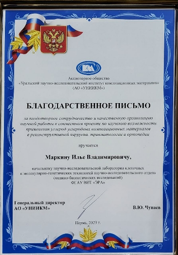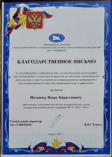 «Участие наших сотрудников в конкурсах подобного уровня крайне важно. Огромное спасибо всем участникам за работу и отдельно благодарю сотрудников Военного инновационного технополиса «ЭРА», Потапова Петра Кирилловича и Маркина Илью Владимировича!»,- отметил генеральный директор АО «УНИИКМ», Чунаев Владимир Юрьевич.