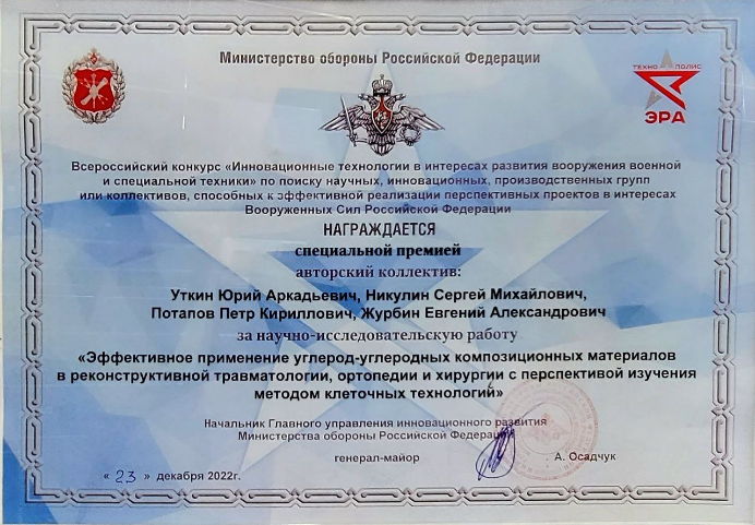 Наша совместная команда с Технополисом «ЭРА» в составе: Уткин Юрий Аркадьевич, Никулин Сергей Михайлович, Потапов Петр Кириллович, Журбин Евгений Александрович, получила первую в истории награду в конкурсе министра обороны РФ.