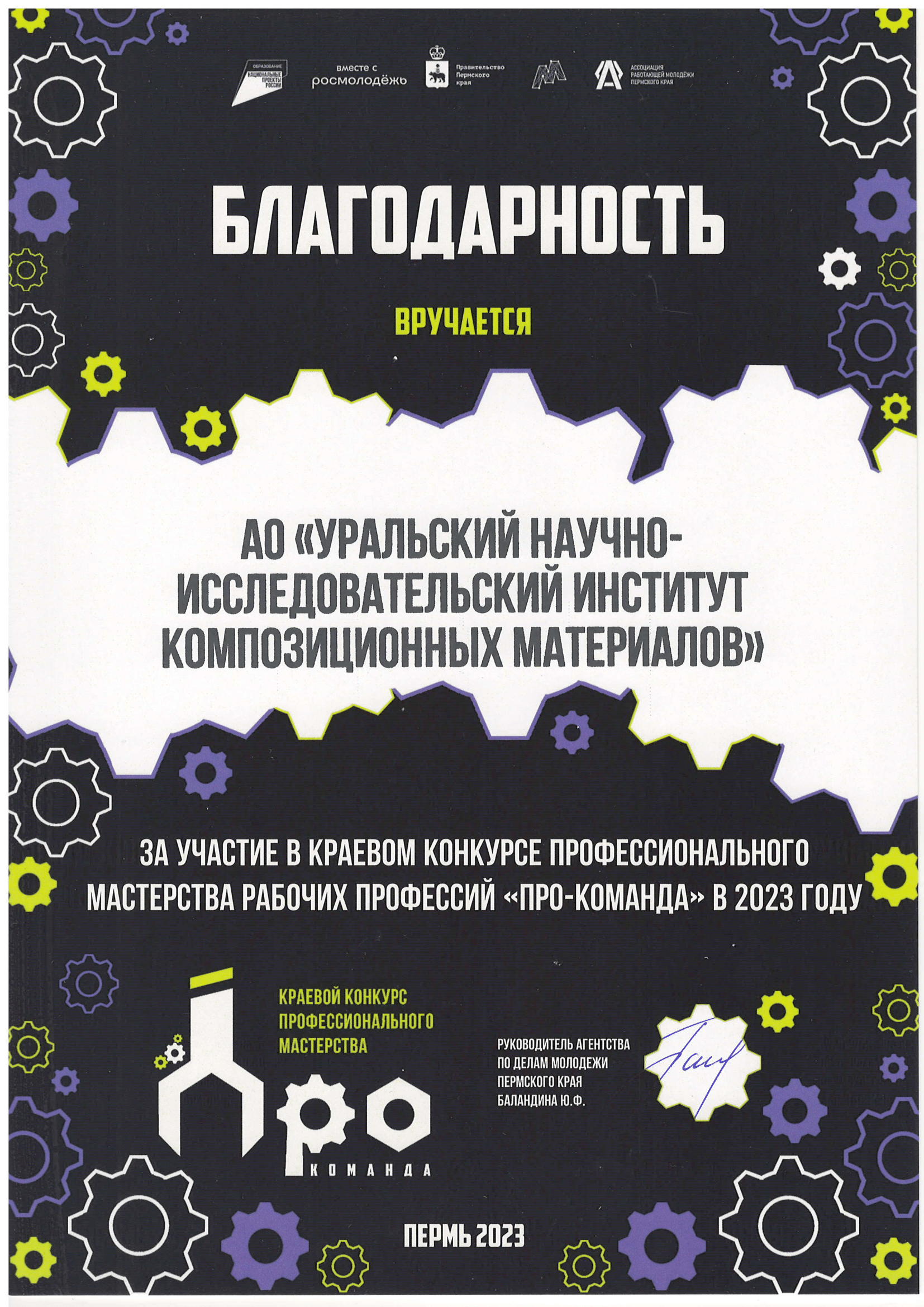 В октябре-ноябре 2023 года состоялся ежегодный конкурс профессионального мастерства рабочих профессий «ПРО-Команда» среди молодых рабочих промышленных предприятий машиностроительного профиля. Основная цель конкурса – повышение престижа квалифицированного труда и формирование мотивации молодых рабочих и студентов. Конкурс проходил в рамках программы комплексного развития сферы молодежной политики в Пермском крае «Регион для молодых» при поддержке Федерального агентства по делам молодежи (Росмолодежь).