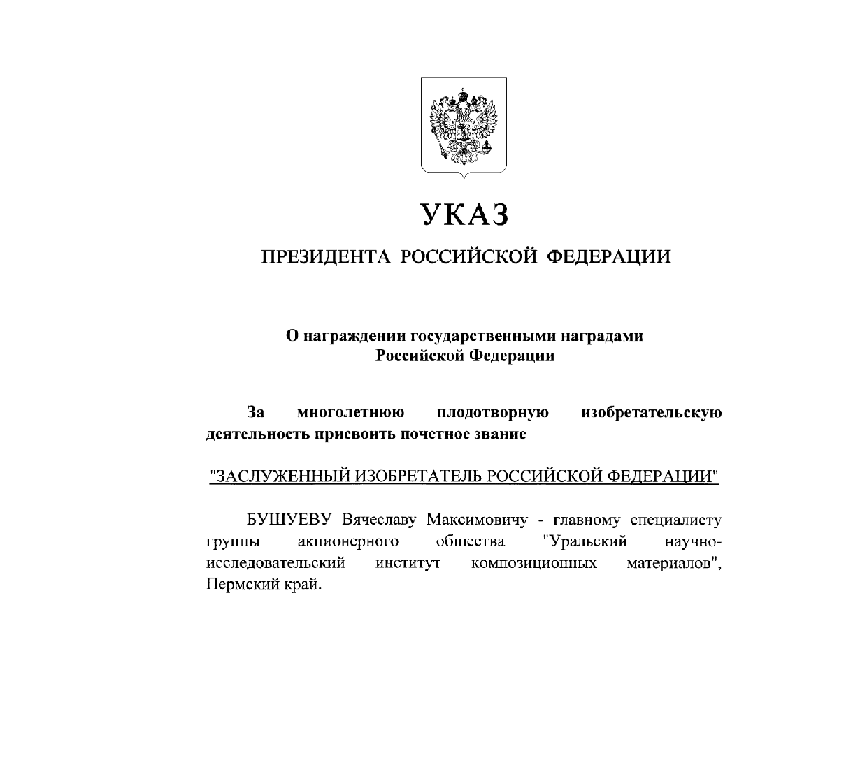 За многолетнюю плодотворную изобретательскую деятельность почетное звание "Заслуженный изобретатель Российской Федерации" присвоено главному специалисту группы АО «УНИИКМ», кандидату технических наук, профессору Академии военных наук БУШУЕВУ Вячеславу Максимовичу. Соответствующий указ подписал Президент России Владимир Путин.